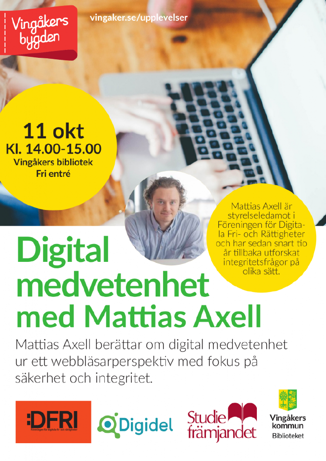 I år har DFRI blivit inbjudna att föreläsa på Vingåkers Bibliotek i Vingåker. Föreläsningen sker 11 oktober 2019 14:00-15:00. Föreläsningen är en introduktion kring digital medvetenhet och hur vi som människor kan vara mer medvetna kring vårt digitala liv, speciellt hur vi använder internet.